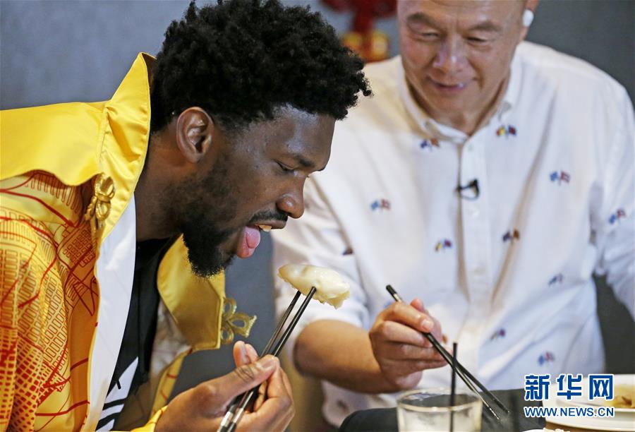 Joel Embiid, a star player for the NBA's Philadelphia 76ers tastes?dumpings on Feb. 15, 2018 (Xinhua/Li Ying)