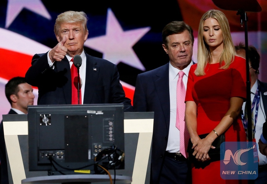 File photo taken on July 21, 2016 shows U.S. Republican presidential nominee Donald Trump gives a thumbs up as his campaign manager Paul Manafort (C) and daughter Ivanka (R) look on during Trump's walk through at the Republican National Convention in Cleveland, the United States. (Xinhua/REUTERS)