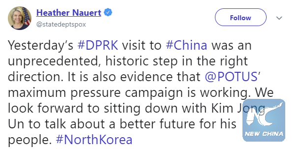 WASHINGTON, March 28 (Xinhua) -- The United States on Wednesday hailed the positive developments on the Korean Peninsula issue, after the just-concluded visit to China by the Democratic People's Republic of Korea (DPRK)'s top leader Kim Jong Un.
