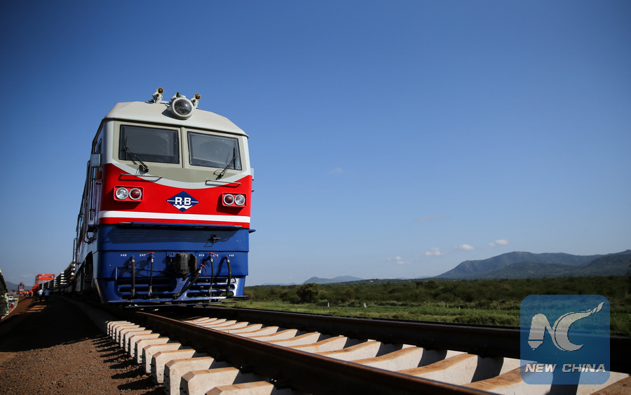 A locomotive is seen at a construction site of the Standard Gauge Railway (SGR) project, near Sultan Halmud, Kenya, on May 28, 2016. (Xinhua/Pan Siwei)