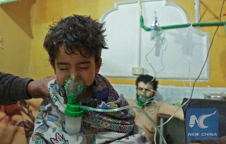 File Photo: Syrian children and adults receive treatment for a suspected chemical attack at a makeshift clinic on the rebel-held village of al-Shifuniyah in the Eastern Ghouta region on the outskirts of the capital Damascus late on Feb. 25, 2018. (Xinhua/AFP)
