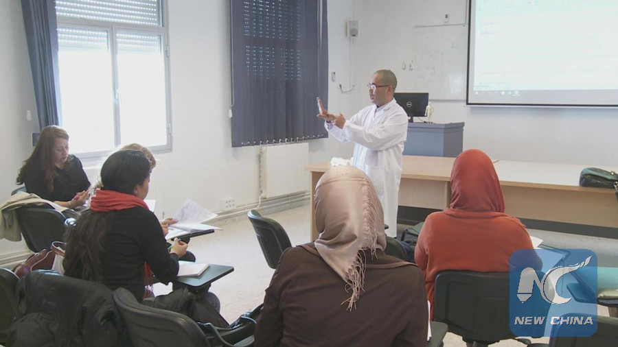 Tunisian doctors are having lessons about Traditional Chinese Medicine in the Chinese acupuncture center. (Xinhua/Liu Kai)