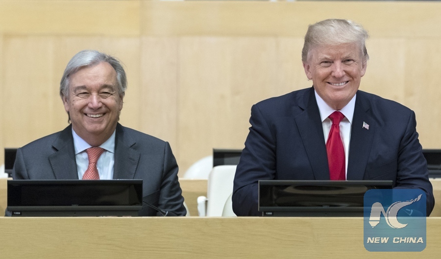 File Photo: United Nations Secretary-General Antonio Guterres (L) and U.S. President Donald Trump pose for a photo prior to a high-level UN reform meeting at the UN headquarters in New York, Sept. 18, 2017. (Xinhua/Li Muzi)