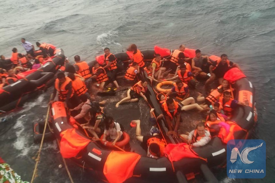Rescued tourists are seen on life rafts near the island of Phuket, Thailand, July 5, 2018. (Xinhua/Rachen Sageamsak)