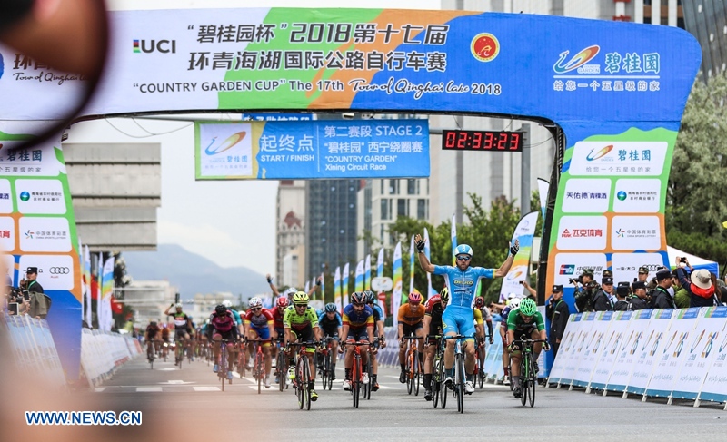 Brenton Jones from French Delko Marseille Provence KTM Team(DMP) wins the second stage of the Tour of Qinghai Lake in northwest China's Qinghai Province, on July 23, 2018. (Xinhuanet Photo by Jia Haiyuan)