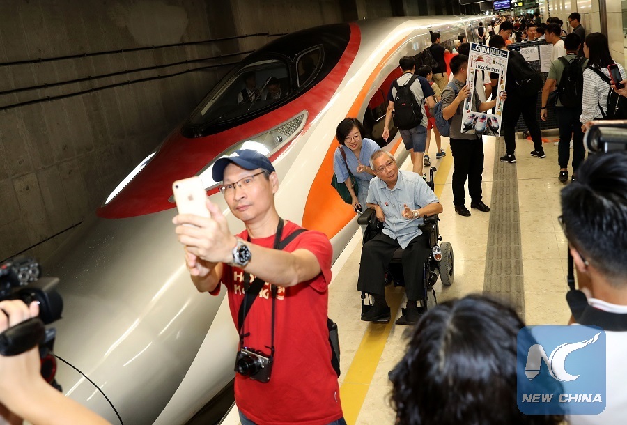 Passengers pose for photos with the train at West Kowloon Station in Hong Kong, south China, Sept. 23, 2018. (Xinhua/Li Gang)