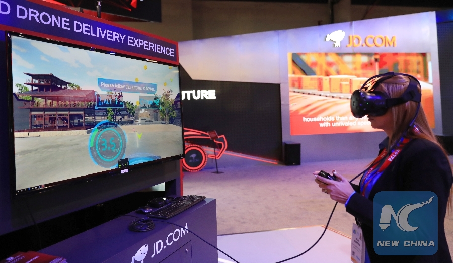 A visitor experiences drone delivery by VR set at the booth of JD. com during the Consumer Electronics Show (CES) in Las Vegas, the United States, Jan. 9, 2019. (Xinhua/Li Ying)