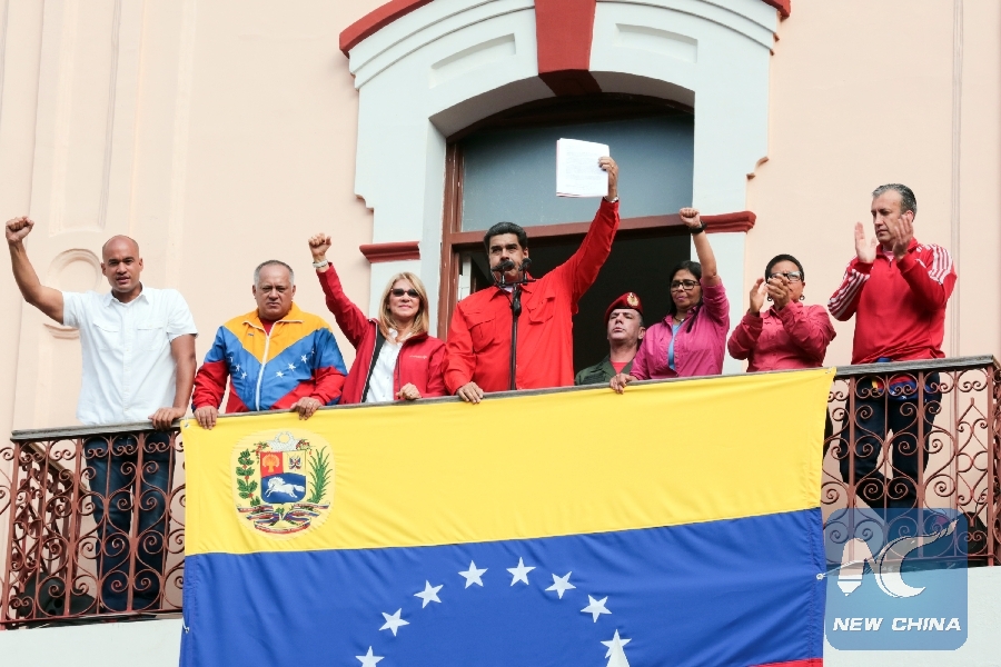 Image provided by Venezuela's Presidency shows Venezuelan President Nicolas Maduro (C) taking part in a rally in support of his government, at the Miraflores Palace, in Caracas, Venezuela, on Jan. 23, 2019. Venezuelan President Nicolas Maduro on Wednesday announced he was severing "diplomatic and political" ties with the United States after the U.S. authorities recognized the opposition leader Juan Guaido as the nation's interim president. (Xinhua/Venezuela's Presidency)