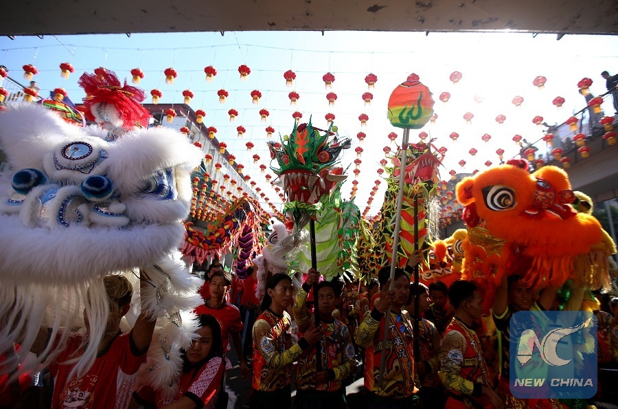 Lion and dragon dance troupe take part during the opening ceremony of Chinese Lunar New Year celebration in the Chinatown of Yangon,Myanmar, Feb. 5, 2019. (Xinhua/U Aung)