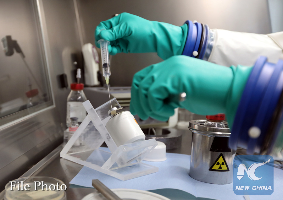 A medical nuclear analytical assistant at the Rotterdam Erasmus Medical Center mixes a preparation of raw material Lutetium Chloride and Lutetium Octoraat, a medicine used to treat patients with a rare form of cancer, in Rotterdam, Netherlands, February 28, 2019. (REUTERS PHOTO)