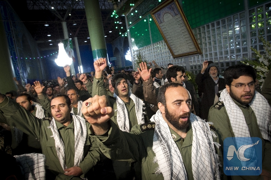 File Photo: Members of Iranian Islamic Revolution Guards Corps (IRGC) shout slogans in Iran's late Islamic revolution leader Ayatollah Khomeini's shrine, in Tehran, Iran, on Feb. 1, 2014. (Xinhua/Ahmad Halabisaz)