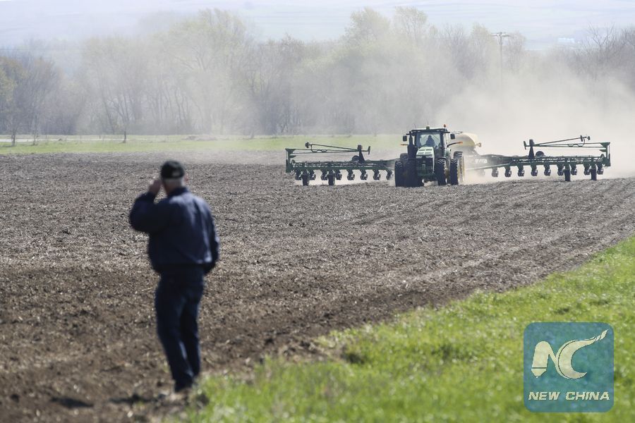 Bill Pellett watches as his son Bret plants corn with a planter machine at their family farm in Atlantic of Cass county, Iowa, the United States, April 24, 2019. (Xinhua/Wang Ying)