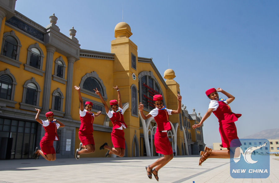 Ethiopian attendants jump at the Lebu station in Addis Ababa, capital of Ethiopia, Jan. 1, 2018. (Xinhua/Michael Tewelde)