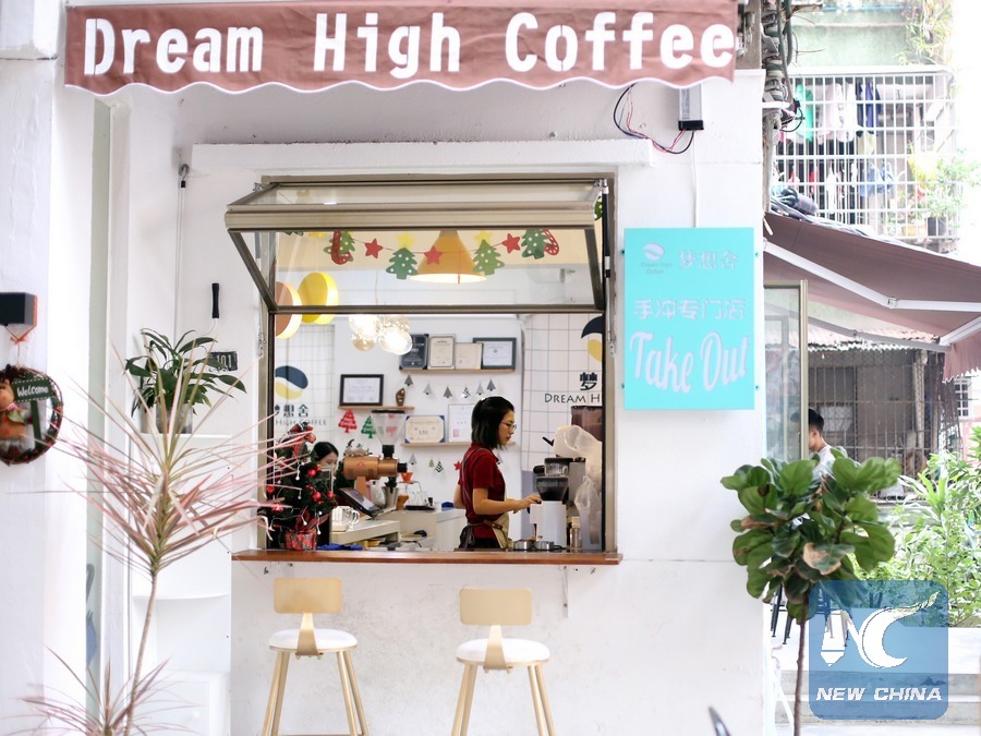 Dream High Coffee cafe is seen at a residential building in Guangzhou, capital of south China's Guangdong Province, Dec. 5, 2018. Dream High Coffee cafe owns a booming business and coffee from Ethiopia is welcomed by customers. (Xinhua/Cheng Li)