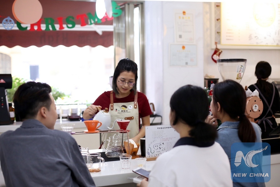 A staff member makes coffee from Ethiopia at Dream High Coffee cafe in Guangzhou, capital of south China's Guangdong Province, Dec. 5, 2018. (Xinhua/Cheng Li)