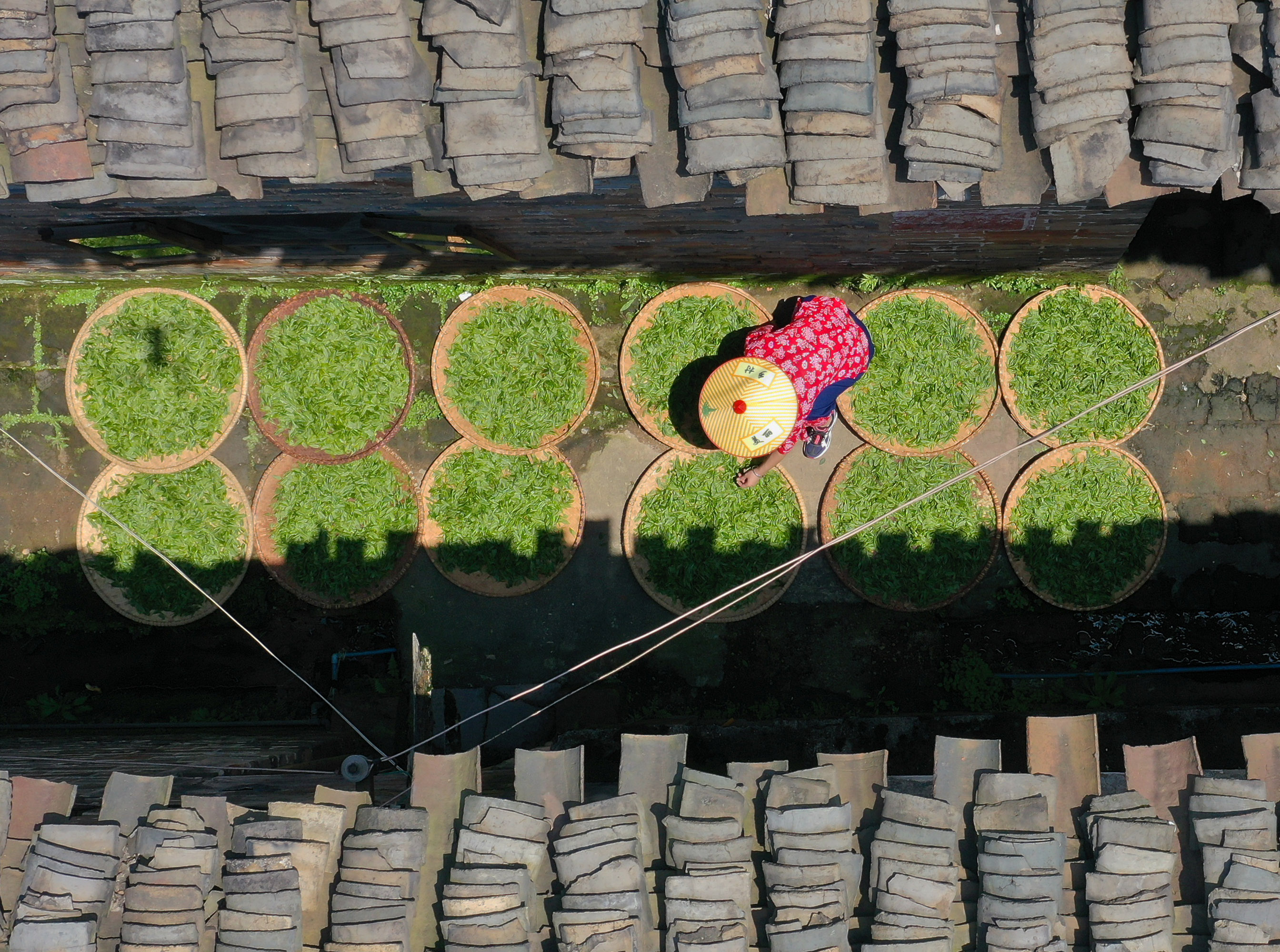 Aerial photo taken on April 7, 2019 shows a villager selecting tea leaves at a tea planting base in Baogai Town of Hengnan County, central China's Hunan Province. Tea planting bases are built in Baogai to provide jobs for local villagers as a method of poverty alleviation in recent years. (Xinhua/Cao Zhengping)