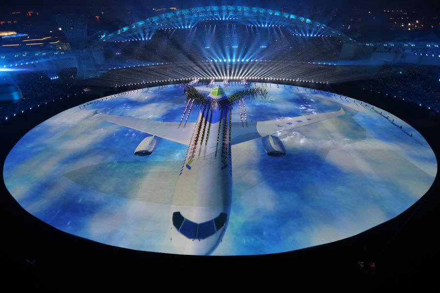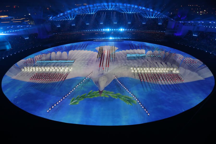Photo taken on Oct. 18, 2019 shows the performance during the opening ceremony of the 7th International Military Sports Council (CISM) Military World Games in Wuhan, capital of central China's Hubei Province.(Xinhua/Chen Yehua)