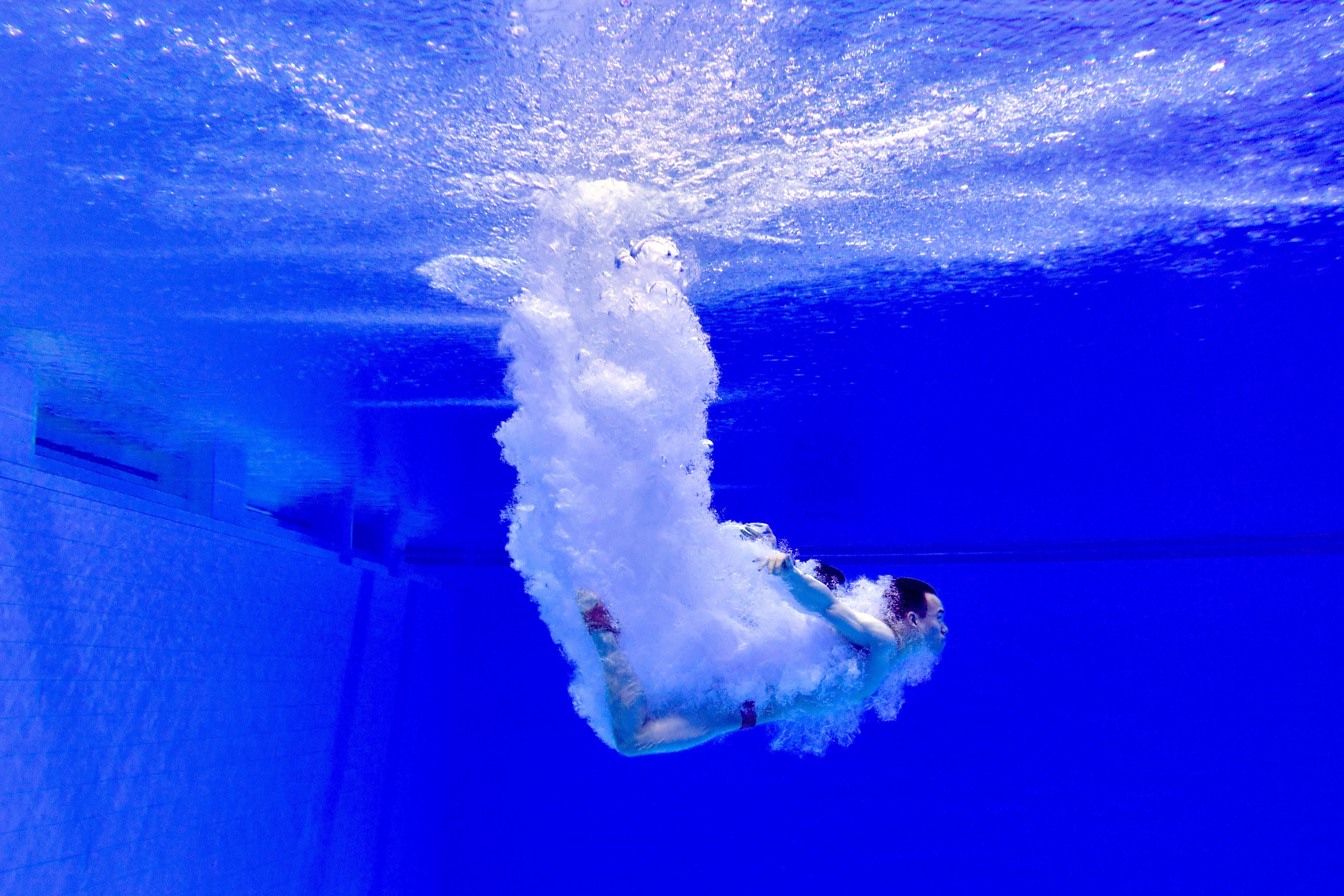 Wang Zongyuan and Xie Siyi of China compete during the men's synchronized 3m springboard final at the 7th CISM Military World Games in Wuhan, capital of central China's Hubei Province, Oct. 27, 2019. Wang and Xie won the gold with 472.20. (Xinhua/Jiang Kehong)