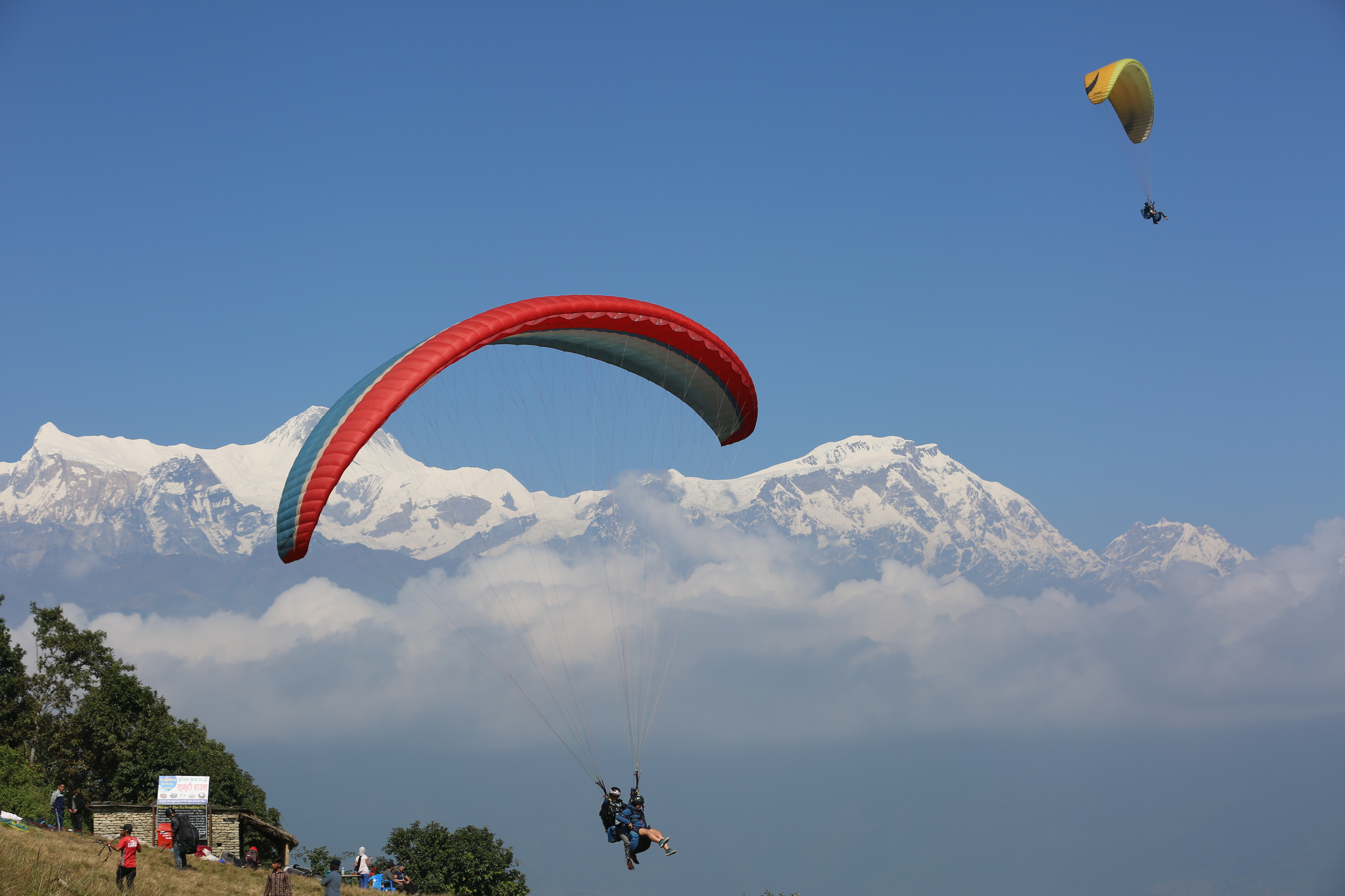 Tourists experience paragliding over a valley in Pokhara, Nepal, Oct. 27, 2019. Pokhara has entered into its peak tourism season, with hundreds of tourists experiencing paragliding each day. (Xinhua/Zhou Shengping)