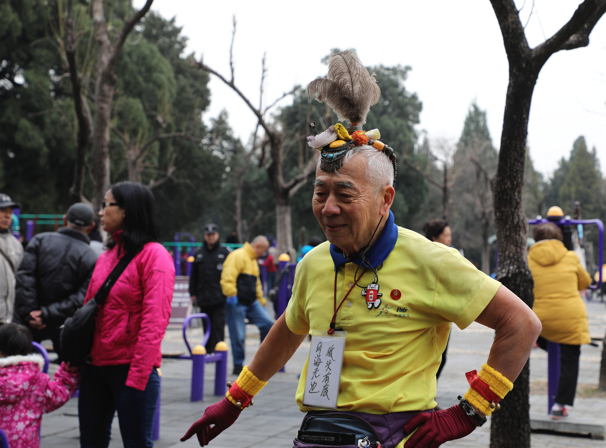 They can be found near the Hall of Prayer for Good Harvest. Some play "jianzi," a game like hacky sack played with a weighted shuttlecock like the one on Yang's head. Others work out on the parallel bar or practice Taiji to traditional music played through portable speakers.