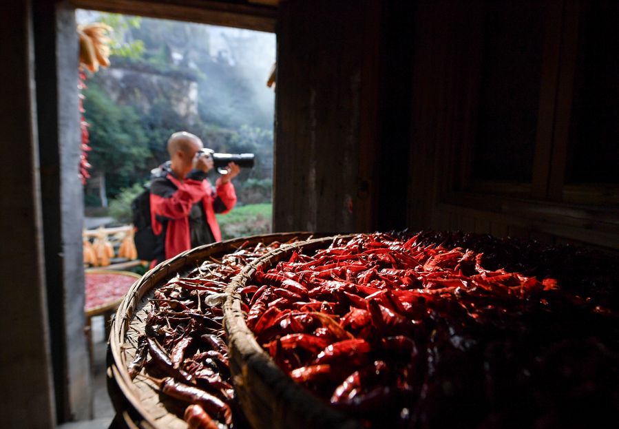 Wearing a kerchief and an apron, Cao Xixiang dries farm produce including chili and pumpkin in bamboo baskets in the bright sunshine. The custom has become a must-see performance for tourists visiting the village. "I can make a living by performing since the village became a tourist attraction," she said.