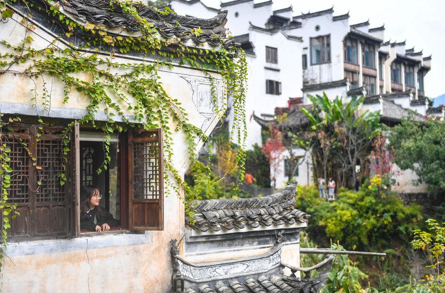 A tourist looks out from a building in Huangling Village of Wuyuan County, east China's Jiangxi Province, Nov. 7, 2019. (Xinhua/Hu Chenhuan)