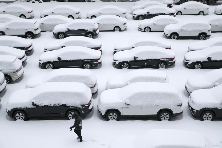 A citizen walks past a parking lot covered with snow in Harbin City, northeast China's Heilongjiang Province, Dec. 17, 2019. (Photo by Zhang Tao/Xinhua)