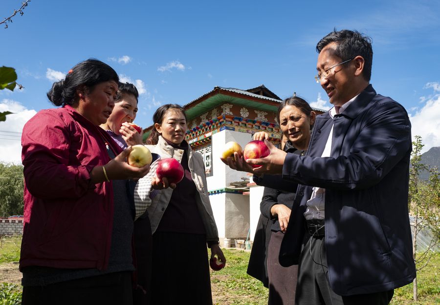 An agricultural expert helps promote a scientific approach of apple planting in a village in Nyingchi, southwest China's Tibet Autonomous Region, Oct. 30, 2019. (Xinhua/Pubu Chagxi)