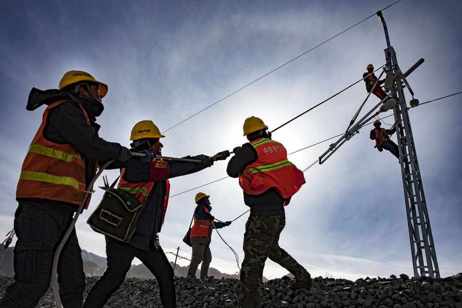 Workers set up facilities for electrified railways in Shannan, southwest China's Tibet Autonomous Region, Jan. 5, 2019. (Xinhua/Jiao Hongtao)