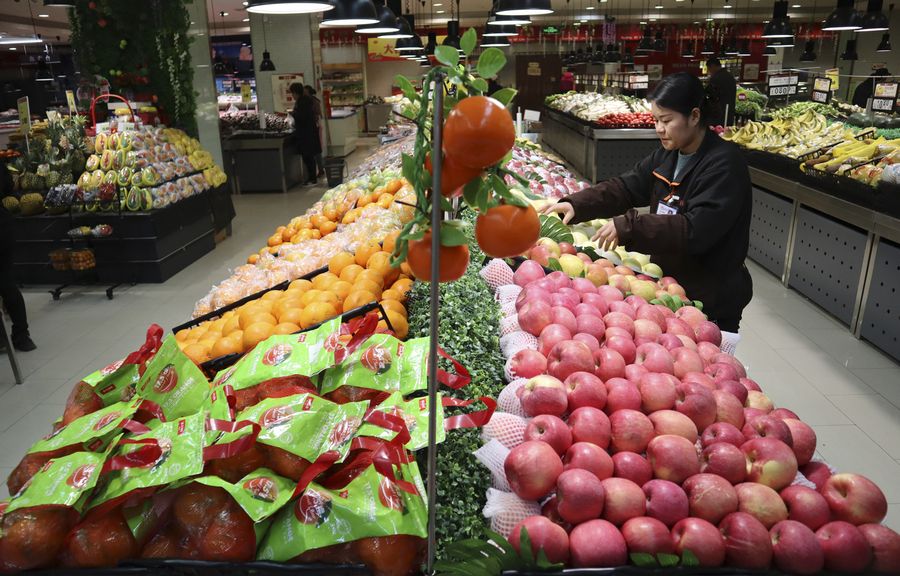 A saleswoman arranges fruit at a supermarket in Handan, north China's Hebei Province, March 9, 2019. (Xinhua/Wang Jiuzhong)