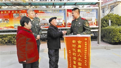 12月9日,孫書偉老人(右二)趕到武警煙臺療養院,將致謝錦旗送給楊紅榮(右一)。