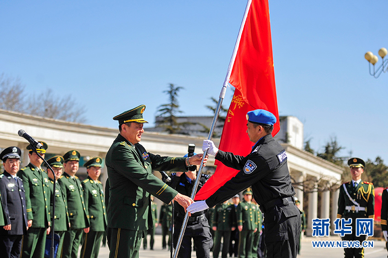 公安部邊防管理局局長陳定武為第四支赴利比里亞維和警察防暴隊(duì)授旗。丁小添 攝