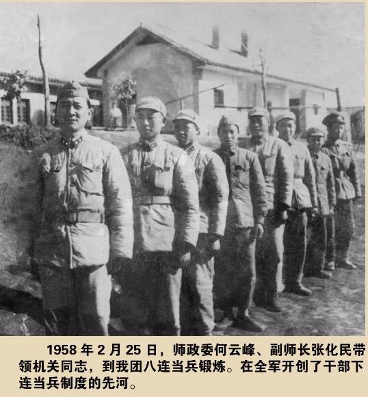 ????1958年8月,毛澤東主席在北戴河召開(kāi)的中央政治局?jǐn)U大會(huì)議上講話指出:“我們的軍官,像云南的一個(gè)師長(zhǎng),一年當(dāng)一個(gè)月兵,我看這是好辦法。……這樣,我們的軍隊(duì)就是永遠(yuǎn)打不散的軍隊(duì)。”毛主席口中的師長(zhǎng),實(shí)際是當(dāng)時(shí)的師政委何云峰,而下連當(dāng)兵的地方便在該團(tuán)三營(yíng)八連,八連也被譽(yù)為下連當(dāng)兵第一連。