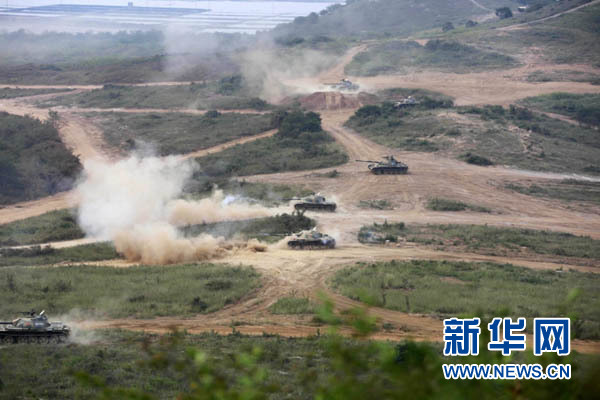 ????演習(xí)中,陸軍第39集團(tuán)軍某紅軍旅坦克分隊(duì)向“敵”發(fā)起進(jìn)攻(2015年9月18日攝)。