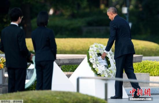 ????資料圖:2016年5月27日,美國總統(tǒng)奧巴馬乘直升機抵達(dá)日本廣島和平紀(jì)念公園附近,展開對和平紀(jì)念公園的訪問并獻(xiàn)上花環(huán)。