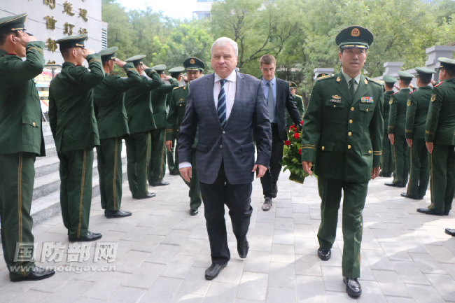 俄羅斯駐華大使安德烈·杰尼索夫向武警警衛(wèi)部隊李登貴烈士雕塑敬獻(xiàn)花籃