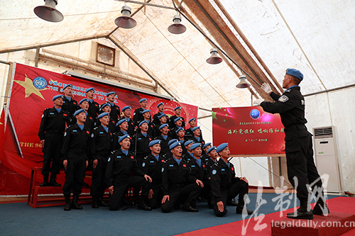????“五星紅旗迎風(fēng)飄揚,勝利歌聲多么響亮”“齊心向黨光輝指引、聚力報國奮勇前進(jìn)”。威武雄壯的歌聲響徹云霄,回蕩在第五支駐利維和警察防暴隊營區(qū)上空。