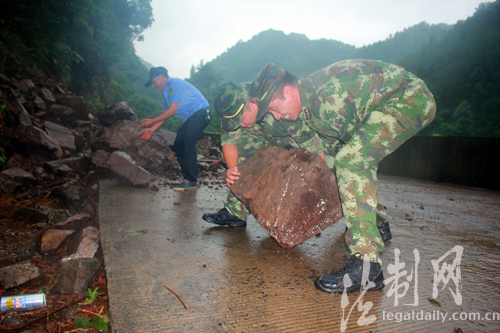 圖為鑒江邊防派出所官兵正齊心協力轉移落石