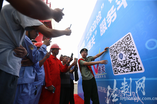 ????8月18日,江蘇邊防總隊鹽城邊防檢查站在大豐港集裝箱碼頭開展了“江蘇邊檢”微信公眾號推廣活動,演示“V通關(guān)”服務(wù)流程,解答服務(wù)對象提問。