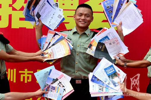 圖為老兵像展示榮譽(yù)一樣展示收獲的崗位招聘資料