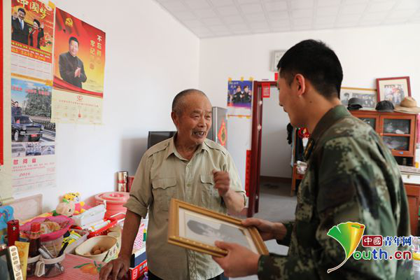 ????孟曉暉的爺爺孟慶欣也曾經(jīng)是一名解放軍戰(zhàn)士,并榮獲過獨(dú)立獎?wù)隆C慨?dāng)說起自己的從軍經(jīng)歷時,這位年過八旬的老人都十分振奮,談到繼承了“紅色基因”的兒孫時,孟慶欣老人的驕傲與自豪更是溢于言表。他說,自己經(jīng)常把當(dāng)年參軍的故事講給子孫聽,曉暉就是聽著爺爺?shù)墓适麻L大的,從小就說自己長大后也要當(dāng)兵。在唱起這首凝聚了他熱血青春與報(bào)國壯志的軍歌之前,老人嚴(yán)肅地說道:“我要換上一身整潔的軍裝!”