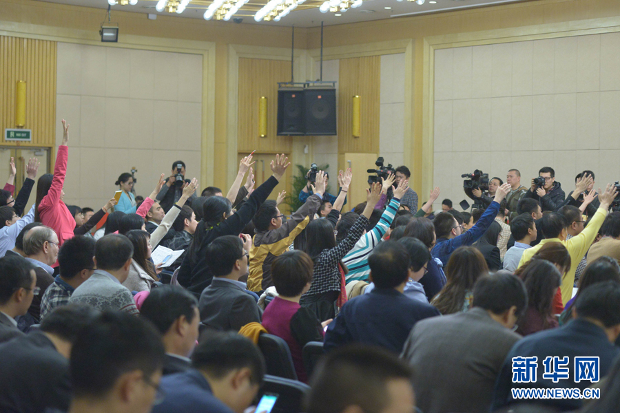 ??? 十二屆全國人大三次會議新聞中心于3月11日10時45分舉行記者會,邀請科技部部長萬鋼就科技改革與發展回答中外記者提問。圖為現場記者舉手提問。新華網/中國政府網 郭小天 攝