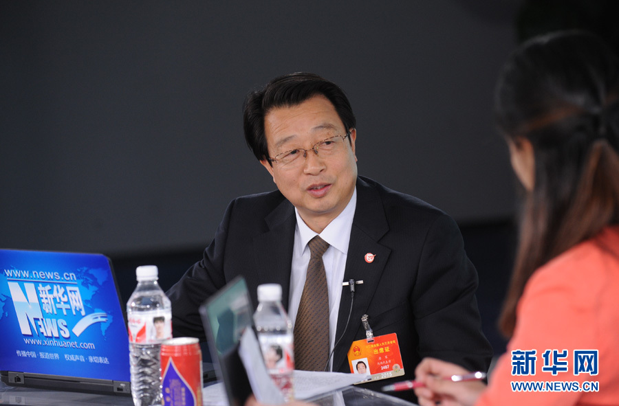 2015年3月13日,全國人大代表、中航飛機股份有限公司總經(jīng)理唐軍做客新華網(wǎng),就航空制造業(yè)面臨的機遇和挑戰(zhàn)與廣大網(wǎng)友展開交流。圖為唐軍與主持人交談。 新華網(wǎng) 陳競超 攝