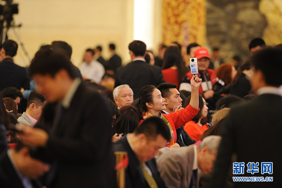 3月16日上午,國務院總理李克強在人民大會堂三樓金色大廳會見采訪十二屆全國人大四次會議的中外記者并回答記者提出的問題。圖為新華網VR報道總理記者會。新華網/中國政府網 陳杰攝