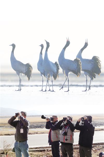上圖:黑頸鶴。下圖:觀鳥者。 陳 飛攝