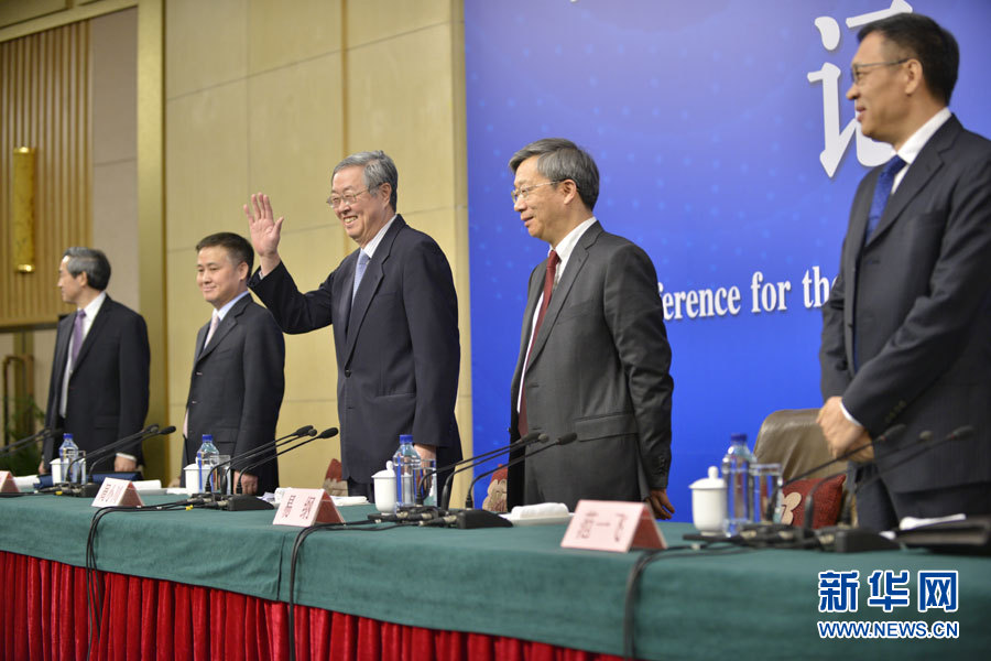 3月10日,十二屆全國人大五次會議新聞中心舉行記者會,邀請中國人民銀行行長周小川、副行長易綱、副行長兼國家外匯管理局局長潘功勝、副行長范一飛就“金融改革與發展”的相關問題回答中外記者的提問。圖為記者會現場。新華網/中國政府網 王健 攝