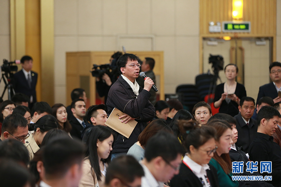 3月11日,十二屆全國人大五次會議新聞中心舉行記者會,邀請工業和信息化部部長苗圩、副部長辛國斌和總工程師、新聞發言人張峰就“推進實施‘中國制造2025’”的相關問題回答中外記者的提問。圖為臺灣旺旺中時媒體集團工商時報記者提問。新華網/中國政府網 傅義洲 攝