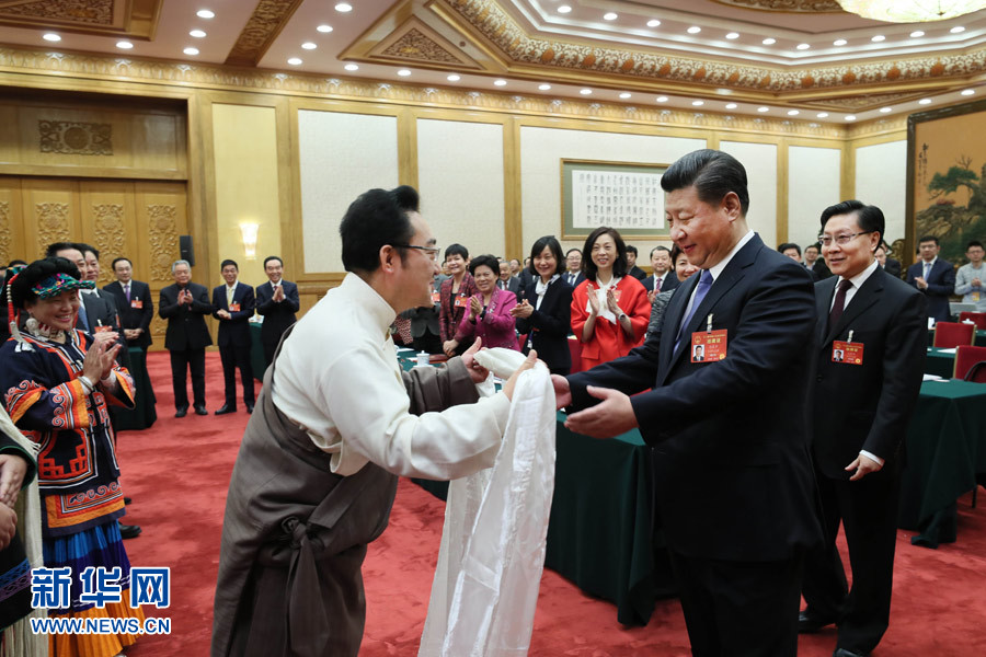 2017年3月8日,習(xí)近平參加十二屆全國人大五次會議四川代表團的審議。習(xí)近平走進會場時,身著民族服裝的藏族、彝族、羌族代表向總書記問好。這是藏族代表獻上潔白的哈達(dá)。新華社記者蘭紅光攝