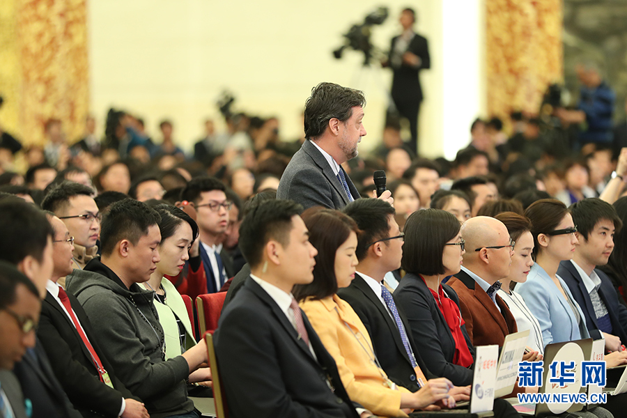3月15日上午,國務院總理李克強在人民大會堂三樓金色大廳會見采訪十二屆全國人大五次會議的中外記者并回答記者提出的問題。圖為美國有線電視新聞網(wǎng)記者提問。新華網(wǎng)/中國政府網(wǎng) 翟子赫 攝?