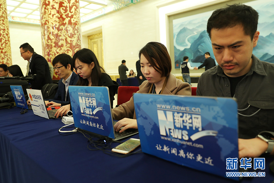 3月15日上午,國務院總理李克強在人民大會堂三樓金色大廳會見采訪十二屆全國人大五次會議的中外記者并回答記者提出的問題。圖為新華網記者在做直播準備。新華網/中國政府網 翟子赫 攝